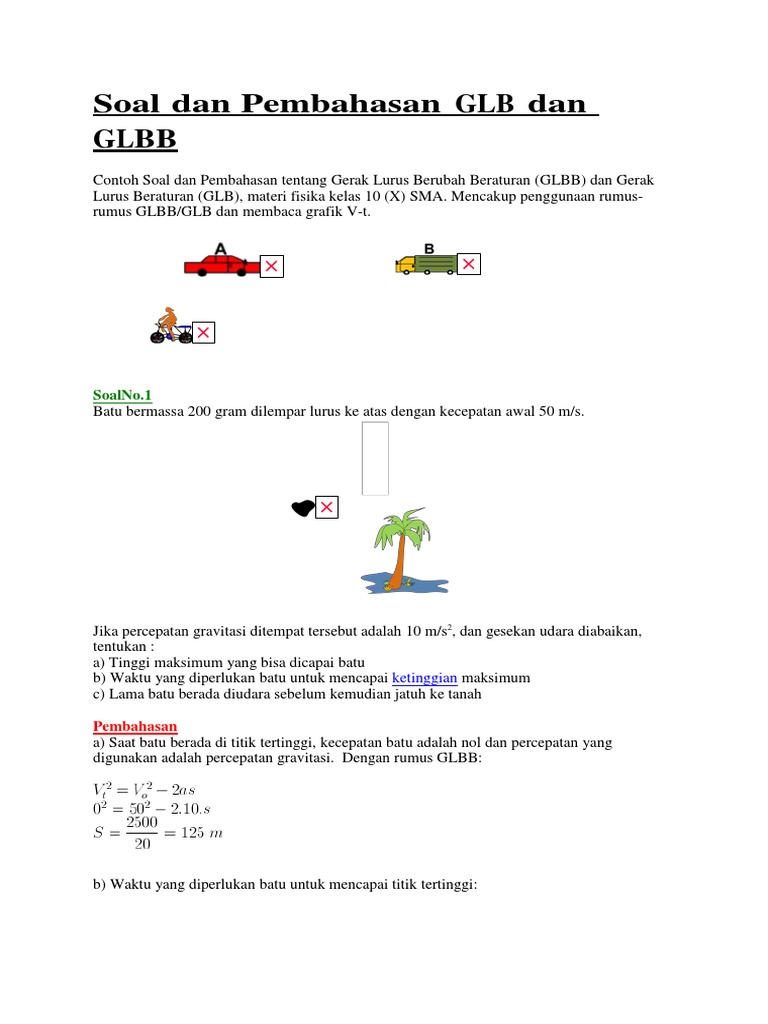 Contoh Soal Fisika Glb Dan Glbb - Contoh Soal Terbaru (Ellen Myers) Contoh Soal GLB dan GLBB Beserta Pembahasannya - Gerak lurus beraturan (GLB) merupakan gerak lurus suatu objek, di mana dalam gerak ini kecepatannya tetap dikarenakan tidak adanya percepatan, sehingga jarak yang ditempuh dalam gerak lurus beraturan adalah kelajuan kali waktu. Beberapa benda bergerak dengan waktu tempuh Jadi, benda yang bergerak lurus beraturan (GLB) dan bergerak lurus berubah beraturan (GLBB) Jawaban: A, B, C. Kulit buah dan sayur adalah contoh dari limbah …. a. organik b. nonorganik c. pertanian d. perkebunan e. industry Jawaban: a. organik.